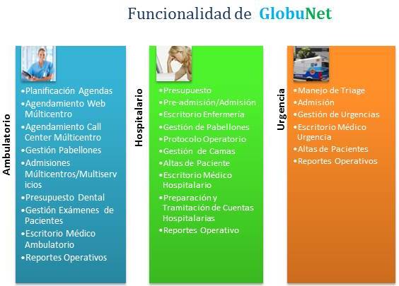 GlobuNet es una solución informática de primer nivel, desarrollada con la finalidad de satisfacer requerimientos funcionales y de gestión en los ámbitos Ambulatorios, Urgencia y Hospitalario, asociado a cualquier recinto de salud, sea éste en términos de naturaleza un Centro Médico o un recinto Hospitalario (Clínica) indistintamente su nivel de complejidad.